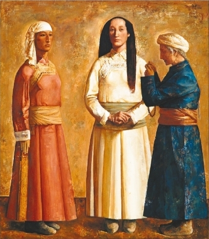 油画家韦尔申创作于1988年的油画《吉祥蒙古》荣获第七届全国美展金奖。画面以蒙古族的传统习俗为线索,通过沉稳坚实的笔调对三位不同年龄的蒙古族妇女进行刻画。透露出画家对庄严、深沉、厚实、质朴和神圣等精神气质的向往,也通过艺术作品将这些精神气质融入和提升了画作的人物形象,表达了画家对少数民族群众的关注与思考。