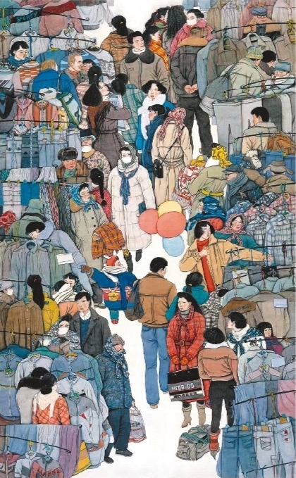 国画家赵斌创作于1992年的中国画《城市三月风》,由鲁迅美术学院中国画学院收藏。作品描绘初春的北方,熙熙攘攘的人群与商业街的繁华景象浑然一体。反映出改革开放政策下,欣欣向荣的城市新风貌。画面采用工笔淡彩的表现形式,结合装饰性色彩及平面性绘画语言,呈现出丰富且统一的绘画效果。